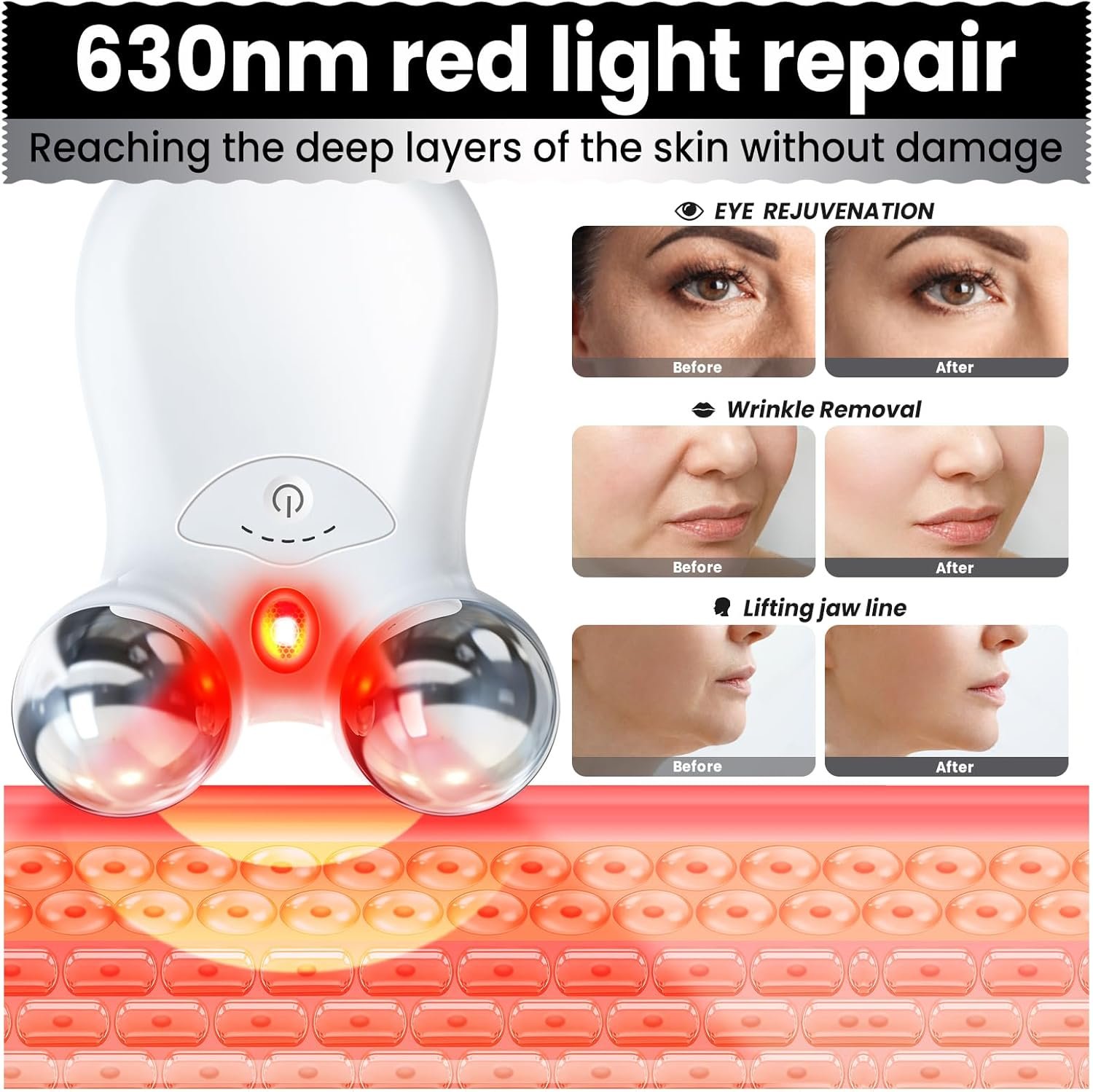 Tone facial muscles and target specific concerns with a handheld that offers three independent modes: microcurrent stimulation for facial toning, 630 nm red light for periorbital wrinkle treatment, and 415 nm blue light for mild to moderate acne; modes operate one at a time for focused dosing. The EP‑300 uses biphasic microcurrent pulses with five adjustable levels and requires conductive gel; LED outputs are narrow‑band with stated power densities and recommended session times per area to simplify routines and support safety.